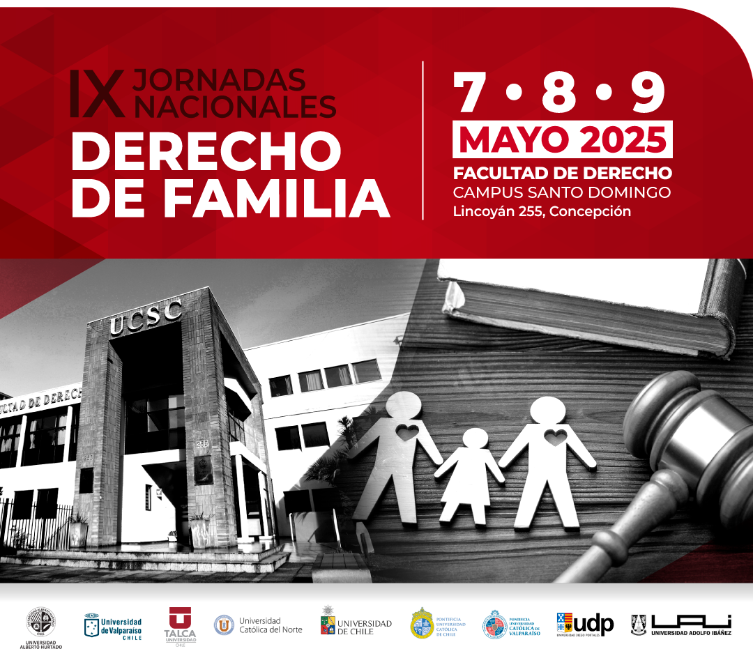 El Consorcio de Universidades organizadoras de las Jornadas Nacionales de Derecho de Familia, integrado por las Facultades de Derecho de la Universidad de Chile, Universidad de Talca, Pontificia Universidad Católica de Chile, Pontificia Universidad Católica de Valparaíso, Universidad Católica del Norte, Universidad Diego Portales, Universidad Alberto Hurtado, Universidad de Valparaíso, Universidad Católica de la Santísima Concepción y Universidad Adolfo Ibáñez, convocan a las IX Jornadas Nacionales de Derecho de Familia, las cuales serán organizadas el presente año por la Facultad de Derecho de la Católica de la Santísima Concepción.